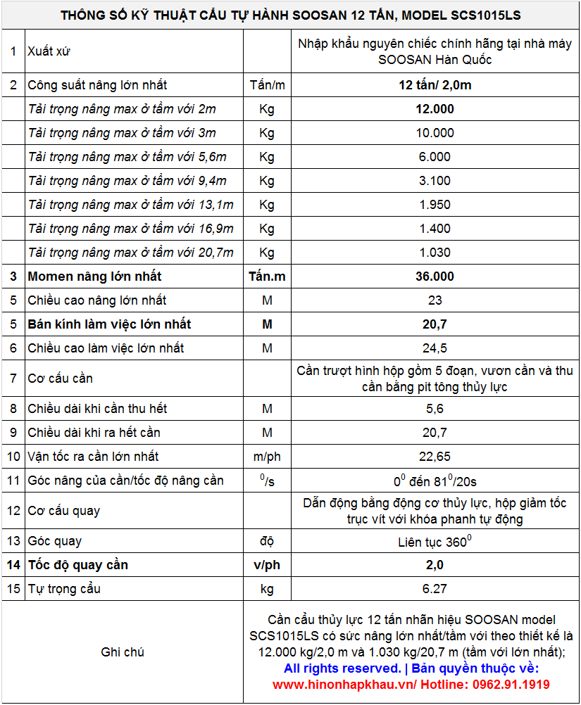 - Cẩu tự hành Soosan 12 tấn Model SCS1015LS thiết kế 5 đoạn, tầm vươn tối đa là 20.7 mét, tại khoảng cách này sức nâng của cẩu là 1.030 Kg ( 1,03 tấn). Cẩu thiết kế nâng tối đa 10 tấn tại tầm với 3 mét, tuy nhiên có thể nâng đến 12 tấn khi ở tầm với là 2 mét. Bán kính làm việc là 20,7 mét, nhưng nếu gắn thêm cần phụ thì tầm vương của cẩu xa hơn là 24.9 mét.