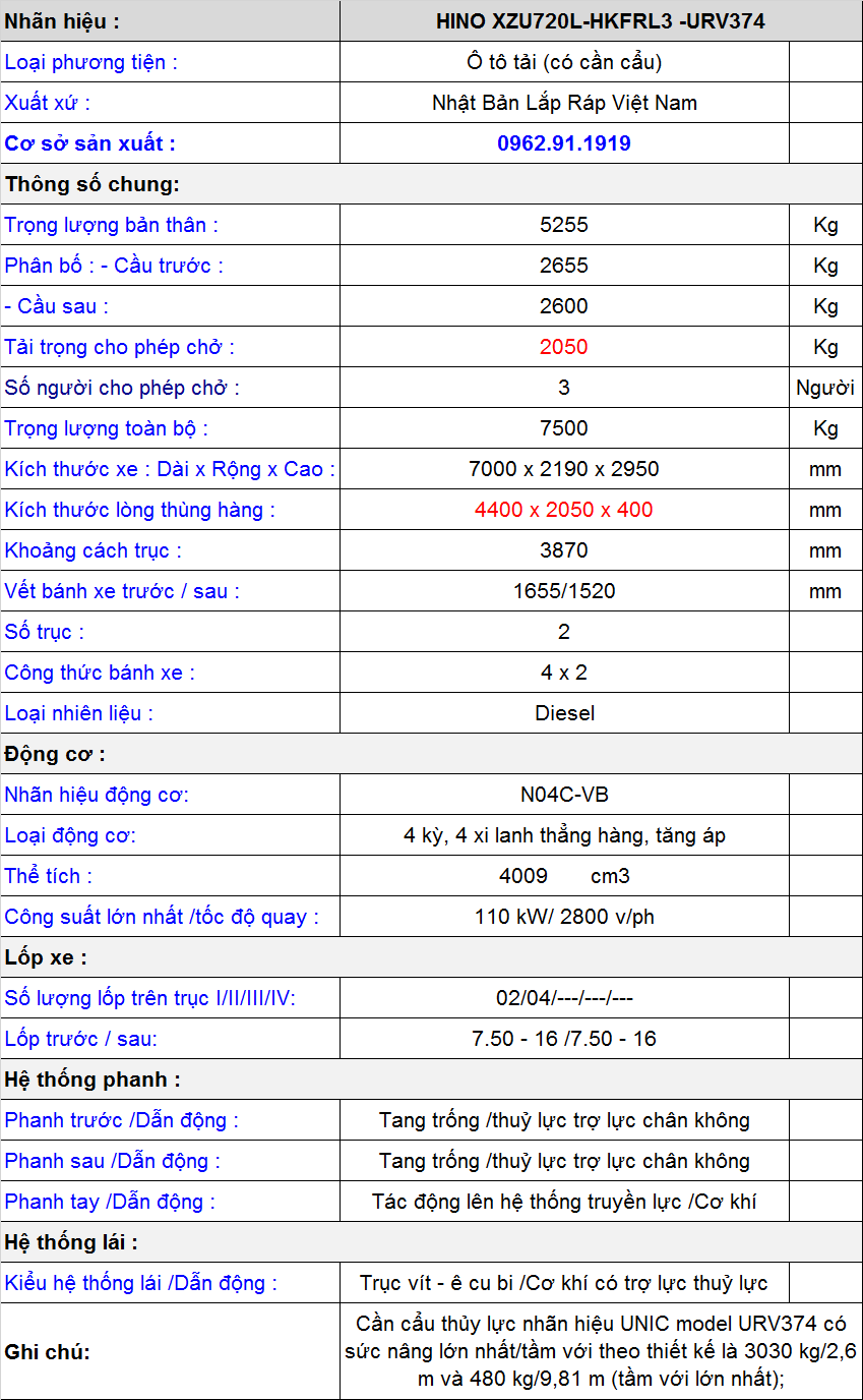 * Thông số kỹ thuật xe tải Hino XZU gắn cẩu Unic URV374 ( 3 tấn 4 khúc):