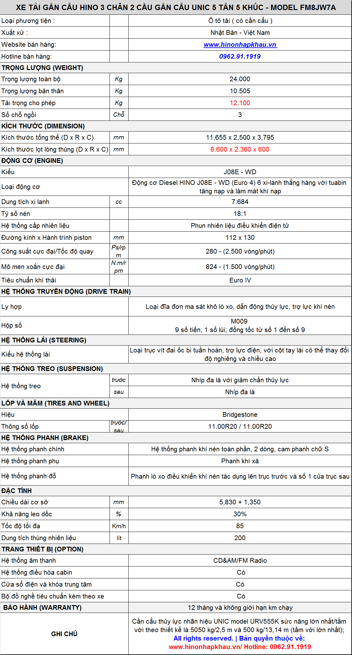 * THÔNG SỐ KỸ THUẬT XE CẨU TỰ HÀNH HINO 3 CHÂN FM8JW7A LẮP URV555K: