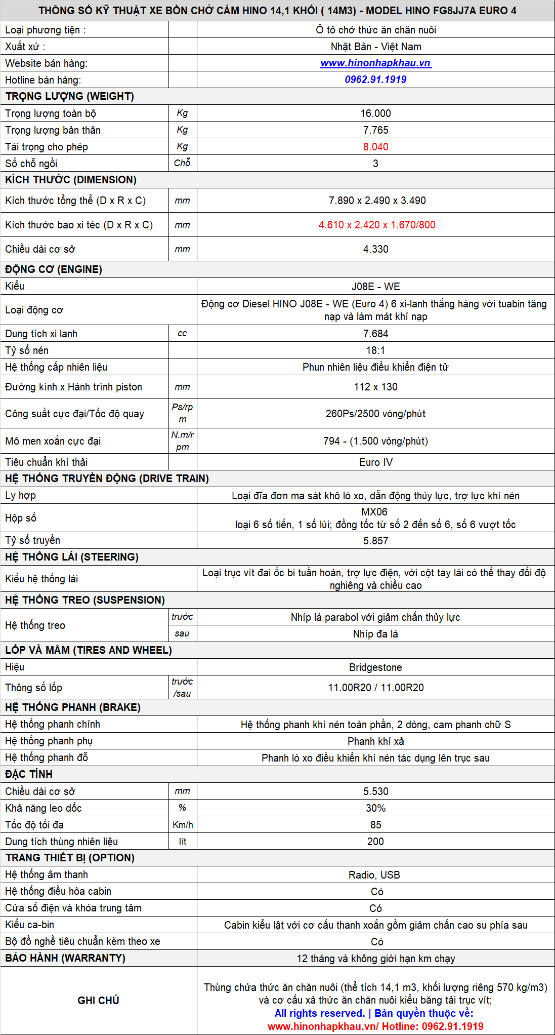 GIỚI THIỆU XE HINO BỒN CHUYÊN DỤNG CHỞ CÁM 14 KHỐI (14M3) HINO - MODEL FG8JJ7A :