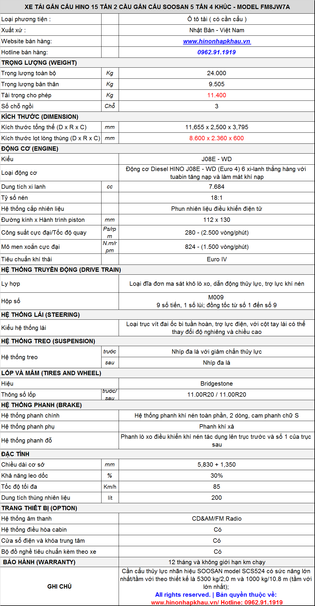 * THÔNG SỐ KỸ THUẬT XE TẢI GẮN CẨU HINO 15 TẤN LẮP CẨU SOOSAN SCS524 ĐỜI NĂM 2024 - 2025: