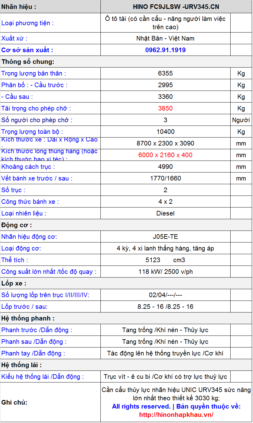 * THÔNG SỐ KỸ THUẬT XE CẨU NÂNG NGƯỜI LÀM VIỆC TRÊN CAO HINO 500 FC9JL7A EURO V: