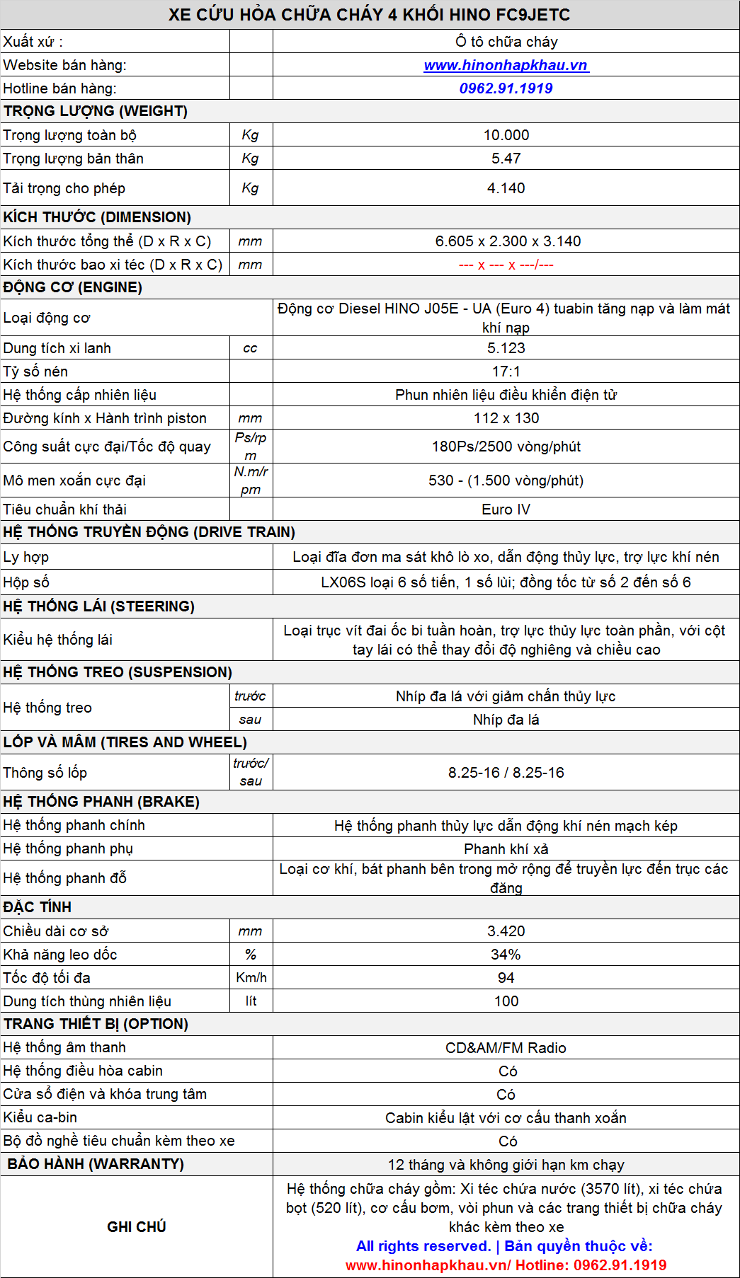 - Xuất xứ: Xe cơ sở Hino linh kiện nhập khẩu 3 cục từ nhà máy Hino Motors Nhật Bản lắp ráp tại nhà máy Hino Motors Việt Nam. Hệ thống chuyên dùng cứu hỏa sản xuất tại Việt Nam.