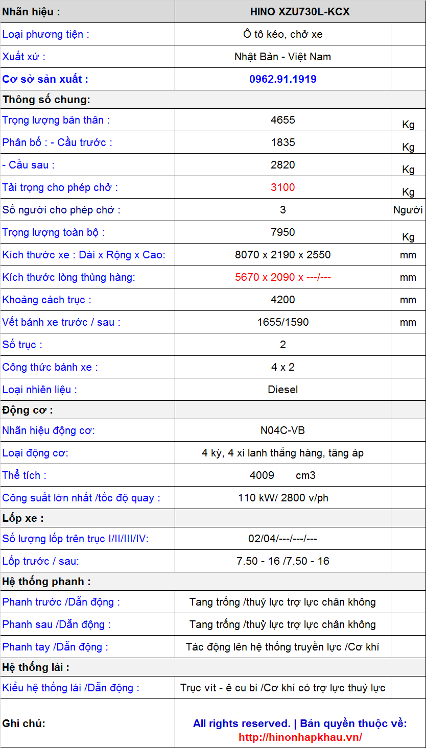 * Thông số kỹ thuật xe cứu hộ 3 tấn Hino XZU730L: