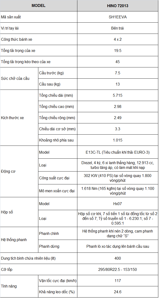 * Thông số kỹ thuật xe Hino đầu kéo 1 cầu Nhật Bản: