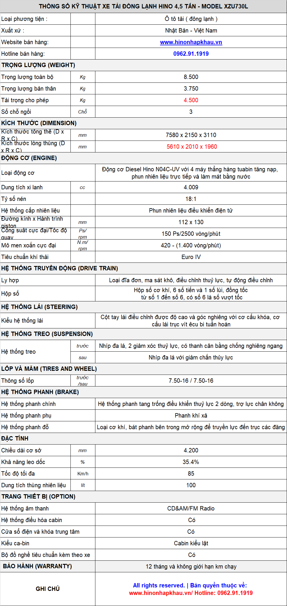 * Dòng sản phẩm XE ĐÔNG LẠNH HINO 4.5 TẤN được bảo hành chính hãng 7 năm hoặc 350.000 Km hưởng chính sách bảo dưỡng theo quy định của hãng tại tất cả các đại lý ủy quyền của Hino Motors trên toàn quốc.