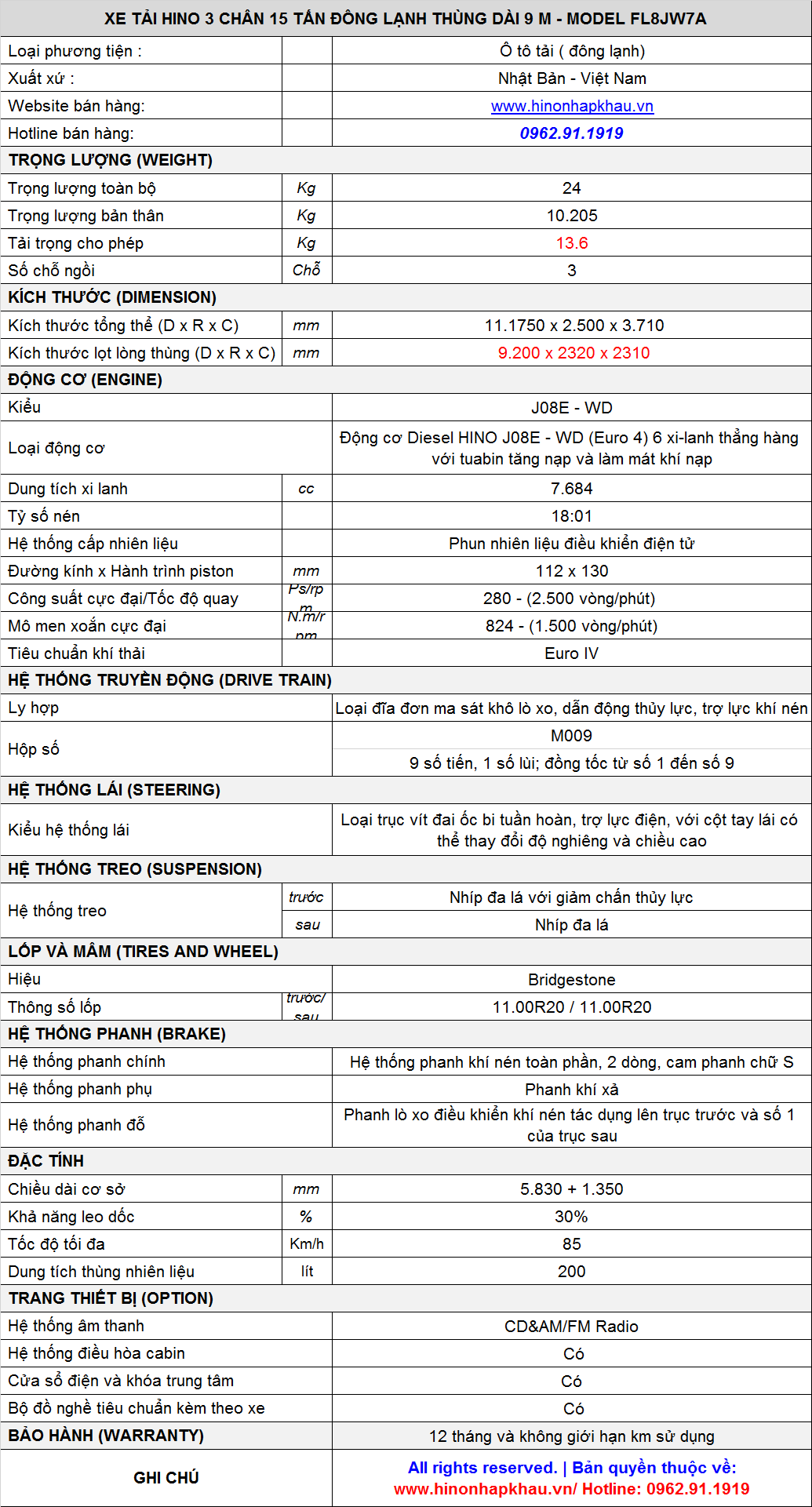 * THÔNG SỐ KỸ THUẬT XE TẢI HINO 3 CHÂN ĐÔNG LẠNH CHỞ HẢI SẢN, THỰC PHẨM, KEM, SỮA, LINH KIỆN :