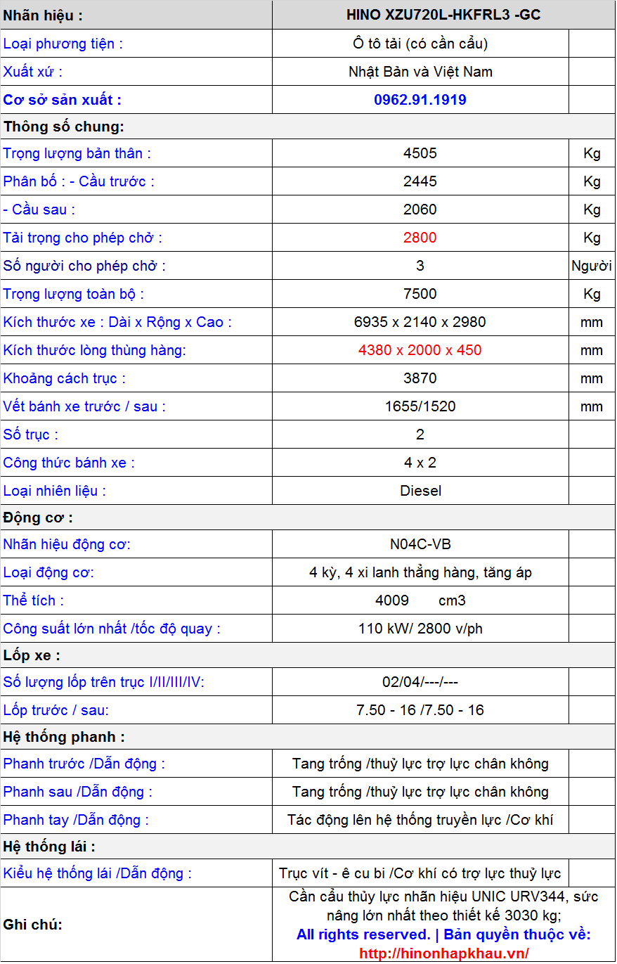 * Thông số kỹ thuật xe tải cẩu 3 tấn 4 đốt URV344 gắn Hino XZU720L: