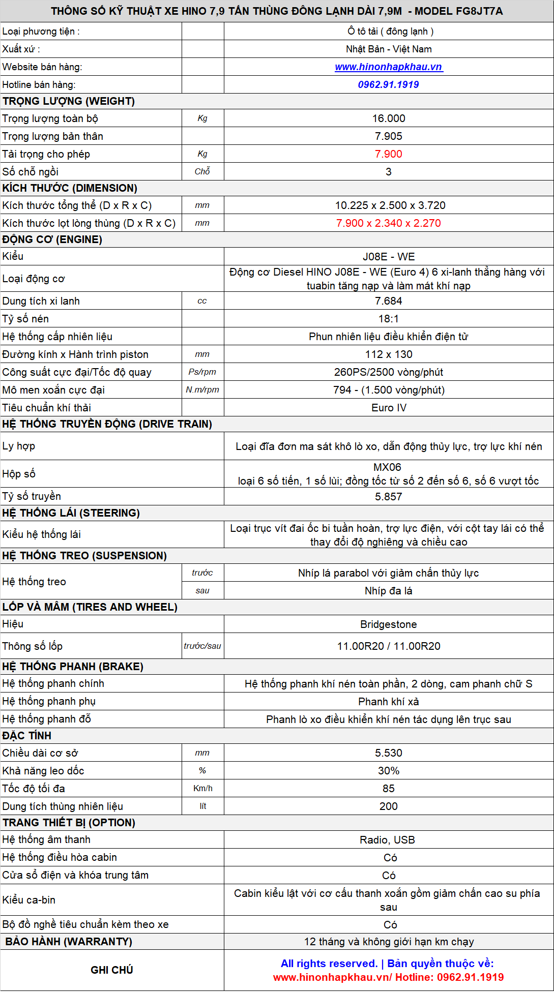 * THÔNG SỐ KỸ THUẬT XE TẢI ĐÔNG LẠNH 8 TẤN EURO 5 HINO FG8JT8A ĐỜI 2024 - 2025 :