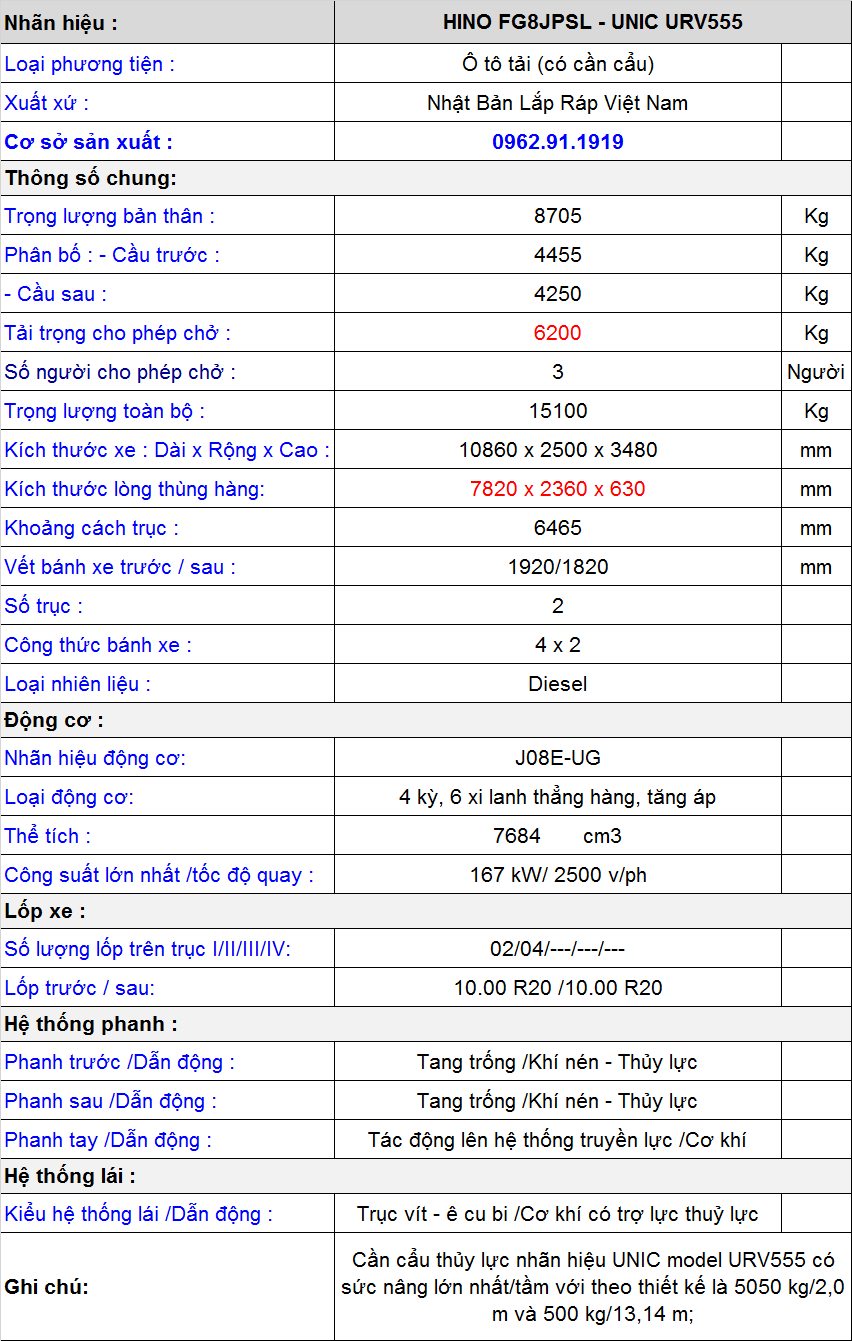 * Thông số kỹ thuật xe tải Hino FG gắn cẩu Unic 5 tấn 5 khúc URV555: