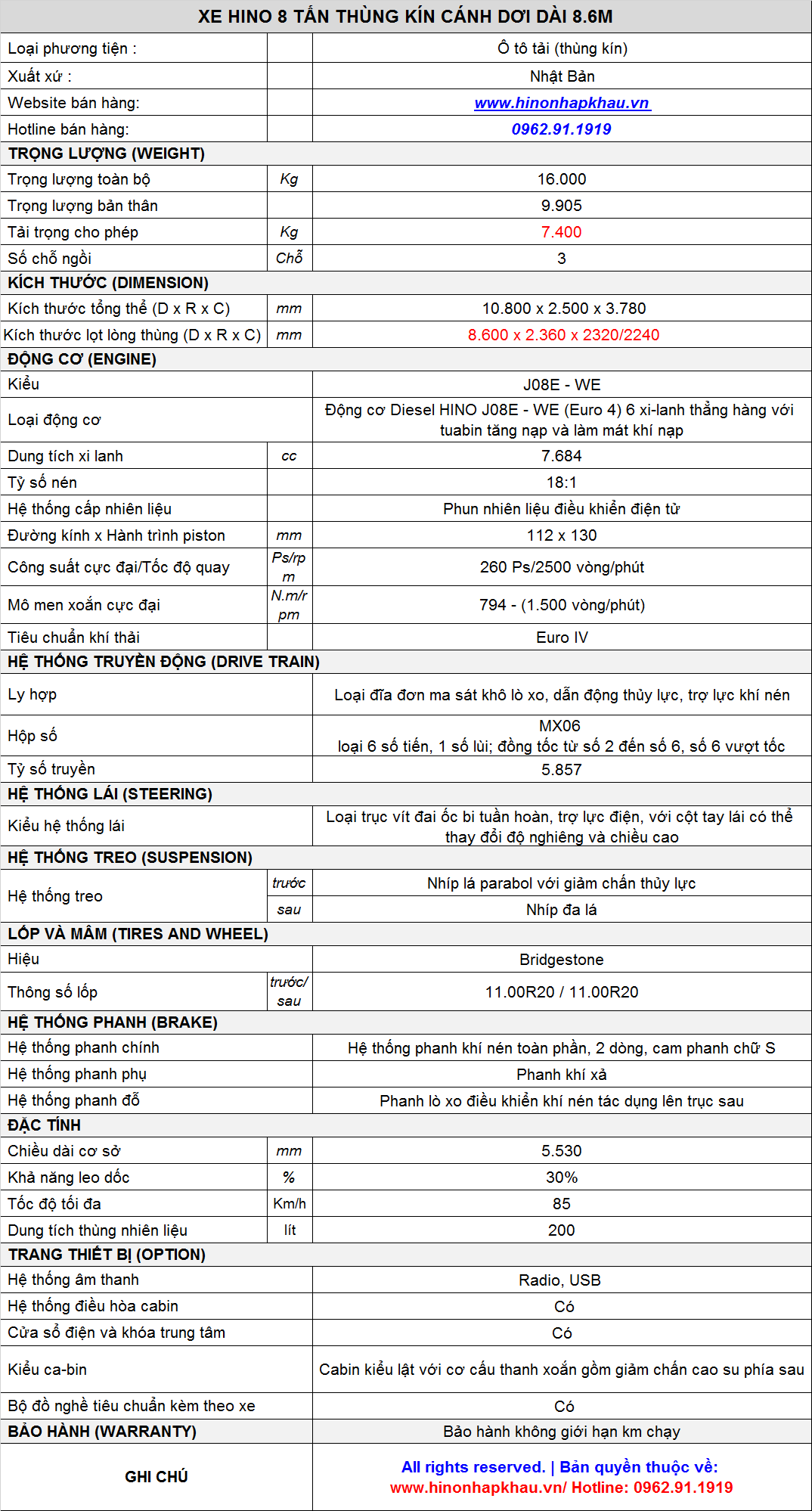 - Xuất xứ: Xe cơ sở nhập khẩu 3 cục Nhật Bản, lắp ráp từ nhà máy Hino Motor Việt Nam. Thùng cánh dơi được sản xuất tại Việt Nam.