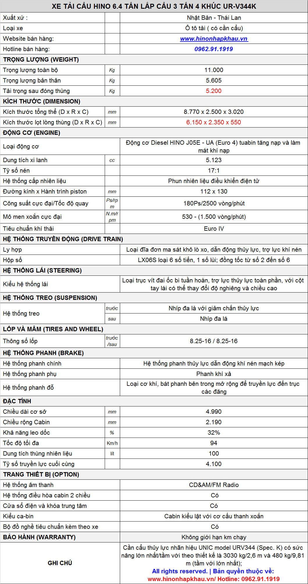 * THÔNG SỐ KỸ THUẬT XE CẨU TỰ HÀNH 6T4 LẮP CẨU 3 TẤN 4 ĐOẠN/ 4 KHÚC/ 4 ĐỐT URV344K: