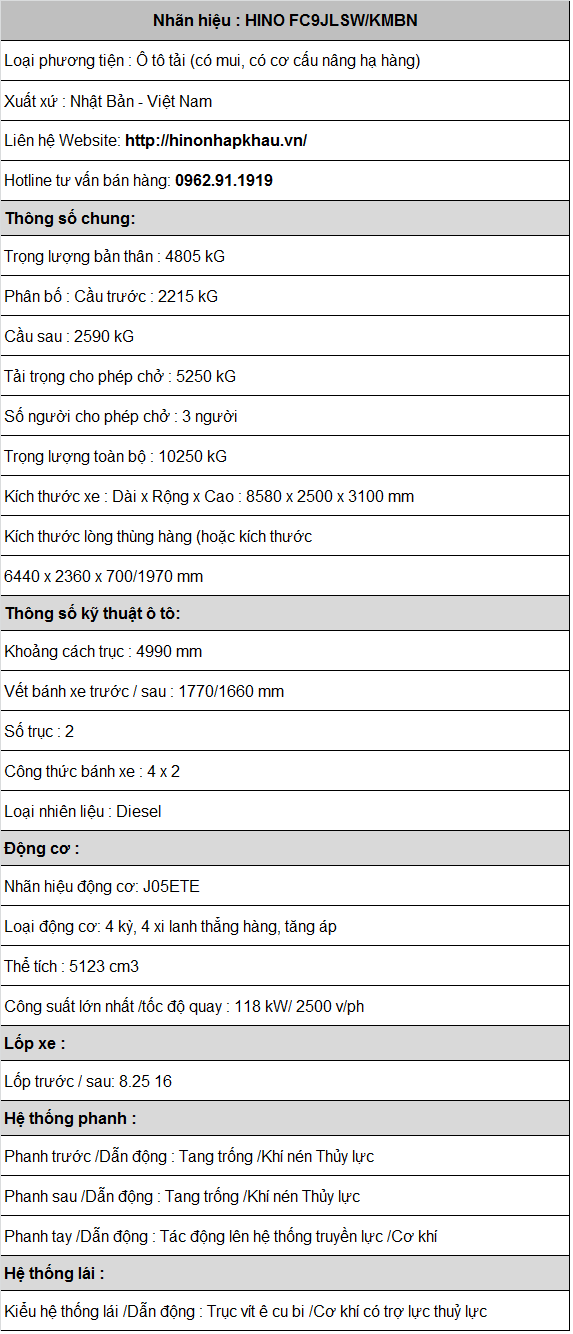 Thông số kỹ thuật xe bửng nâng hạ - xe tải Hino FC thùng mui bạt bửng nâng hạ: