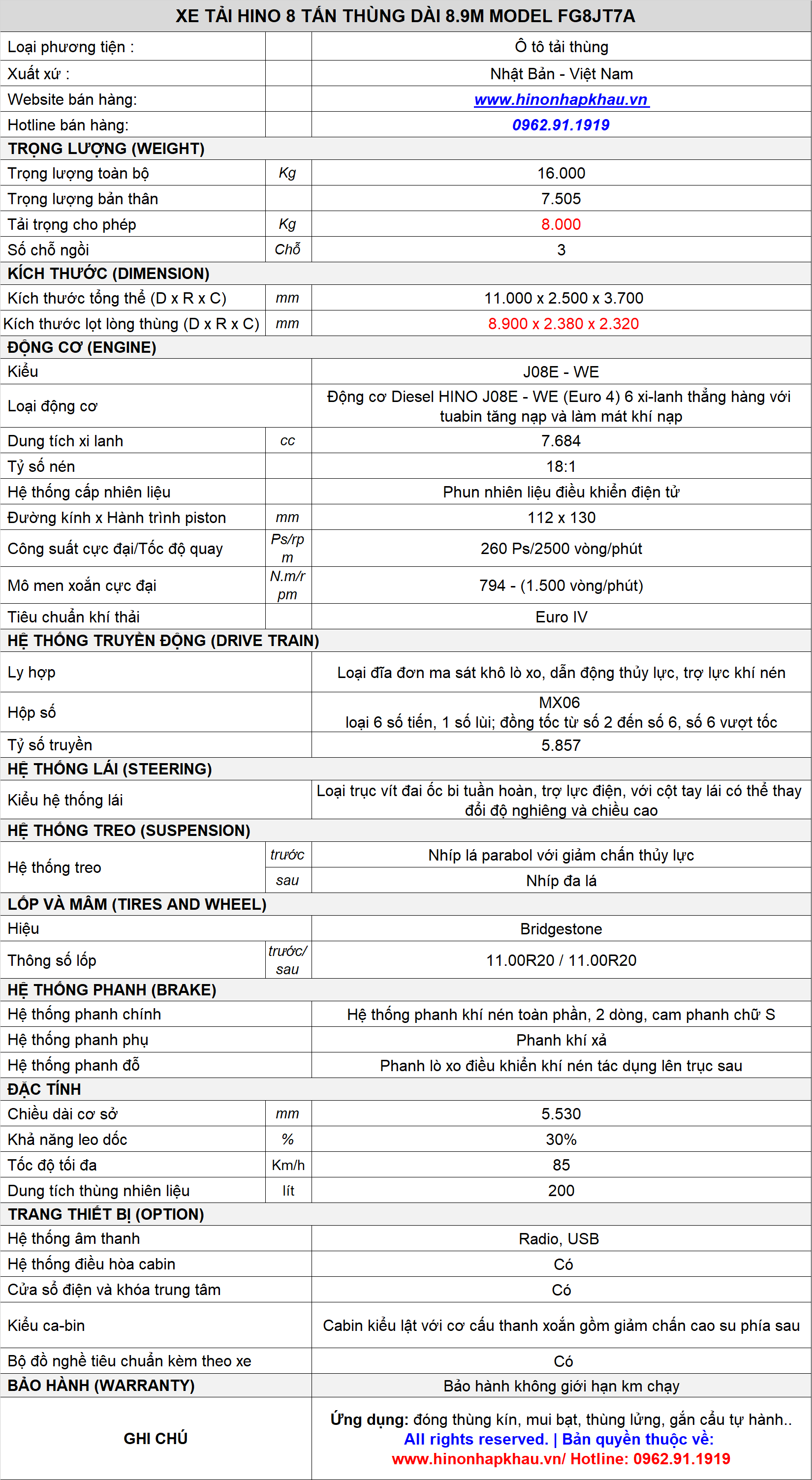 * THÔNG SỐ KỸ THUẬT XE TẢI HINO 8 TẤN EURO 5 MODEL FG8JT7A EURO V ĐỜI 2025 - 2026: