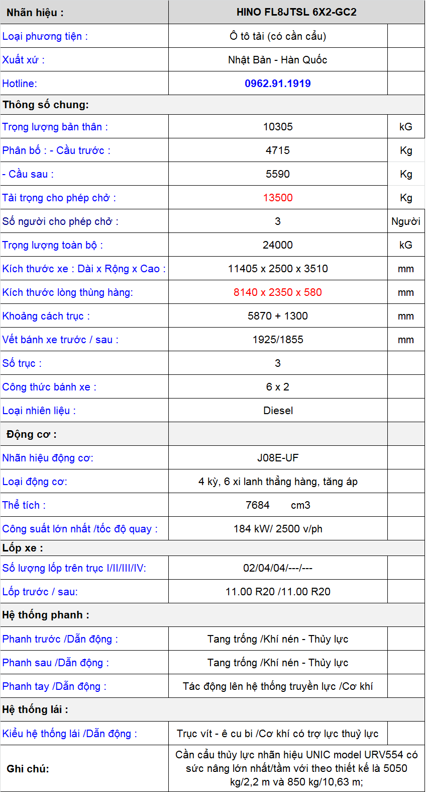 * Thông số kỹ thuật Xe Hino 3 chân thùng dài gắn cẩu Unic 5 tấn UR-V554: