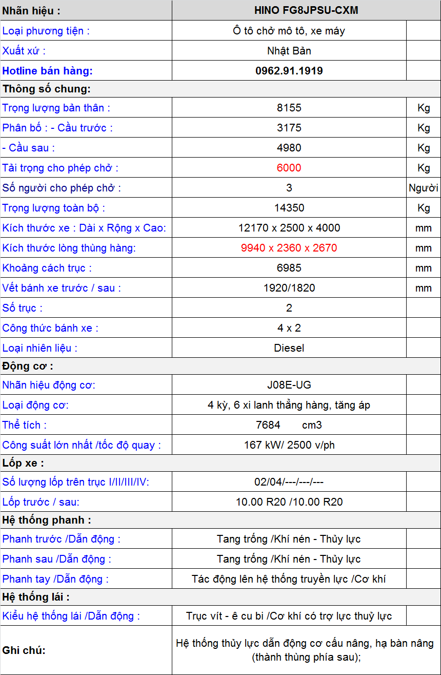 * THÔNG SỐ KỸ THUẬT XE CHỞ XE MÁY BỬNG NÂNG 2 TẦNG THÙNG DÀI 10 MÉT HINO 500 FG:
