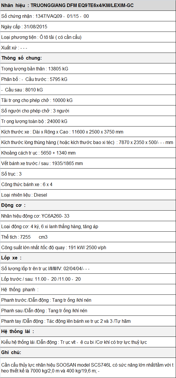 * Thông số kỹ thuật xe tải Trường Giang 3 chân gắn cẩu 7 tấn 6 đốt: