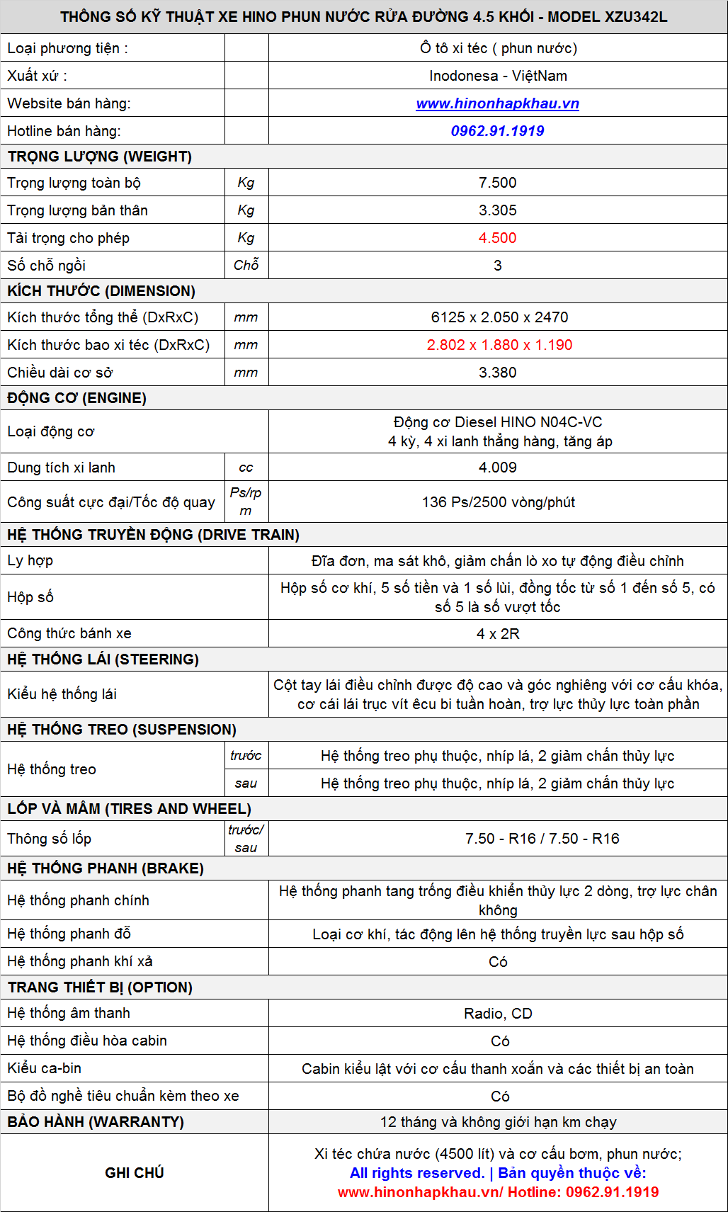 * THÔNG SỐ KỸ THUẬT XE HINO 300 PHUN NƯỚC RỬA ĐƯỜNG 4.5 KHỐI:
