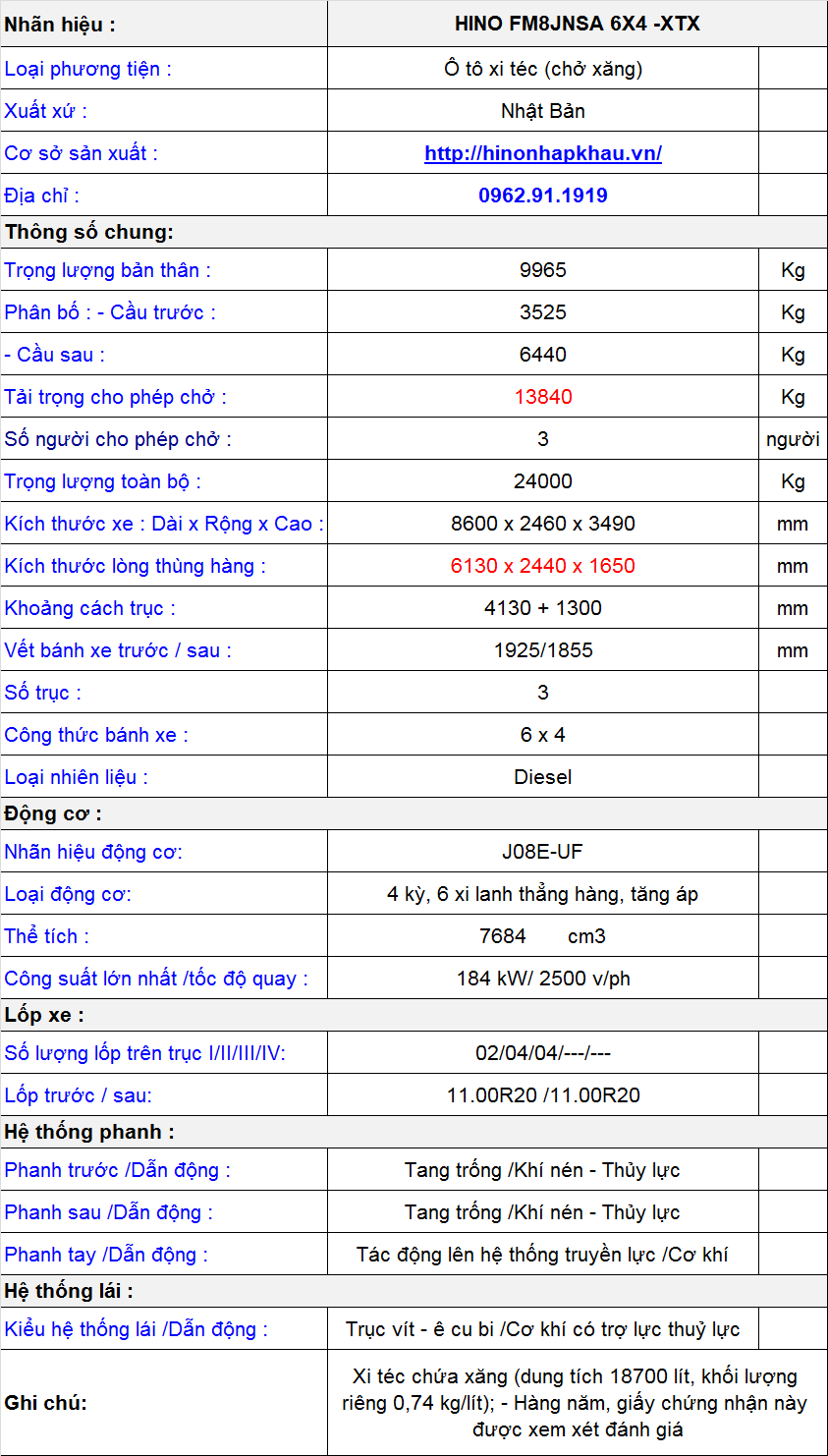 * Thông số kỹ thuật xe Xi téc Hino chở xăng 18 khối - Xi téc Hino FM8JNSA: