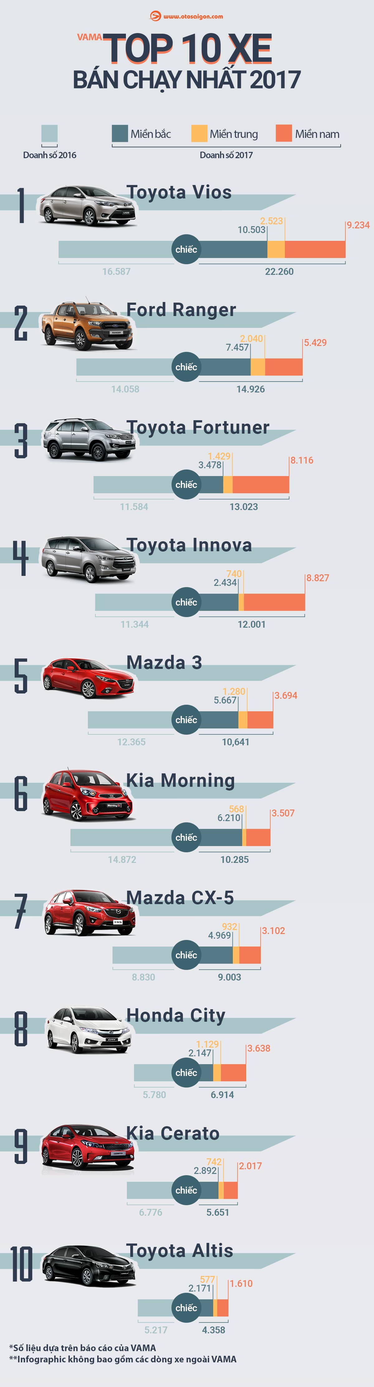 10 mẫu xe ô tô bán chạy nhất Việt Nam năm 2017: