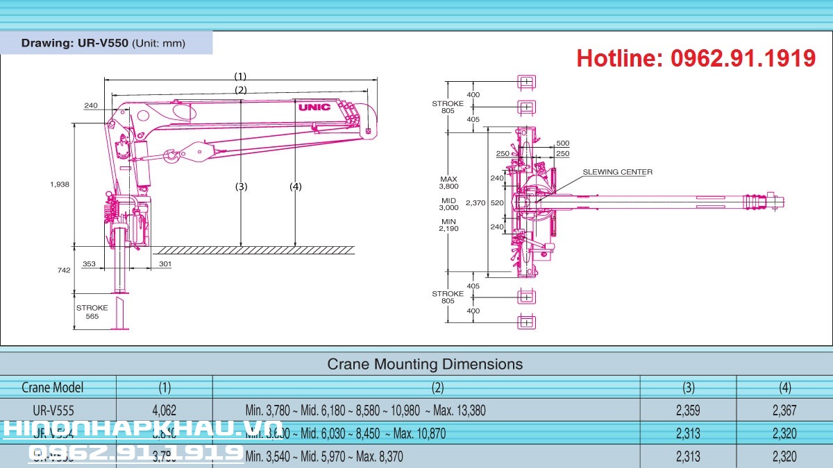 - Chiều cao tối đa của dòng cẩu này là 15.1 mét với cẩu Unic 5 đoạn URV555K. Tìm hiểu Cẩu Unic 5 tấn URV550 này phù hợp với các dòng xe tải của Hino như FC, FG hay FL 3 chân và Hyundai như HD210 gắn cẩu 5 tấn, với tải trọng 12.8 tấn – 14 tấn hay xe HD320 4 chân với tải trọng còn lại 15,7 tấn, với dòng xe HD360 5 chân của Hyundai thì tải trọng còn lại là 19 tấn.