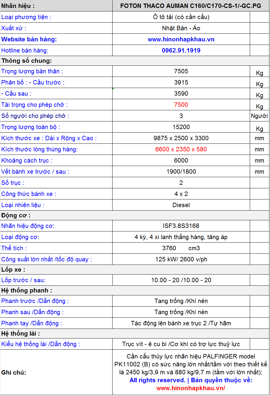 * THÔNG SỐ KỸ THUẬT XE CẦN CẨU GẤP 5 TẤN PALFINGER 5 TẤN PK11002: