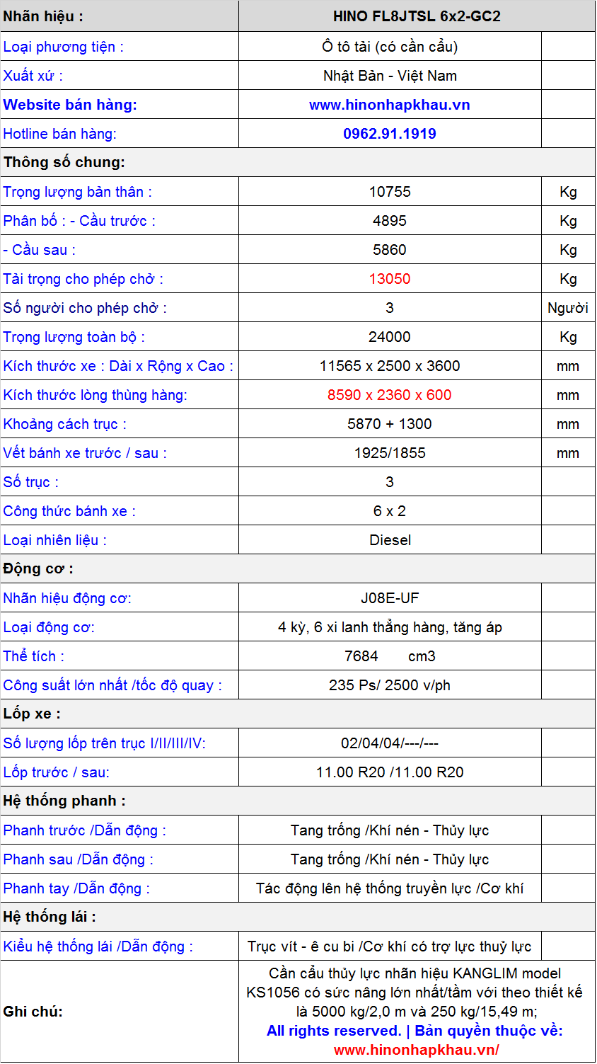 * THÔNG SỐ KỸ THUẬT XE TẢI CẨU HINO 15 TẤN GẮN CẨU KANGLIM 5 TẤN 6 ĐỐT KS1056: