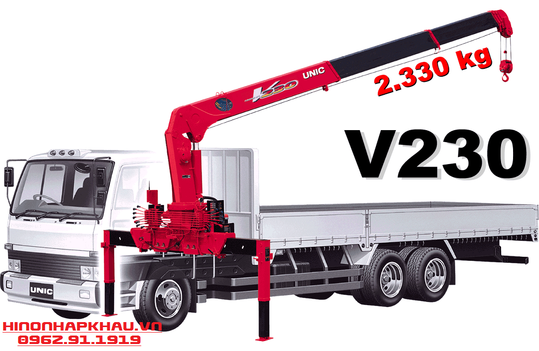- Cẩu Unic Series UR-V230 (Sức nâng max 2,33 tấn, loại tiêu chuẩn, chân chống tròn, dầm chân chống thẳng hàng, vận hành ra-vào bằng tay, lên-xuống bằng thủy lực).
