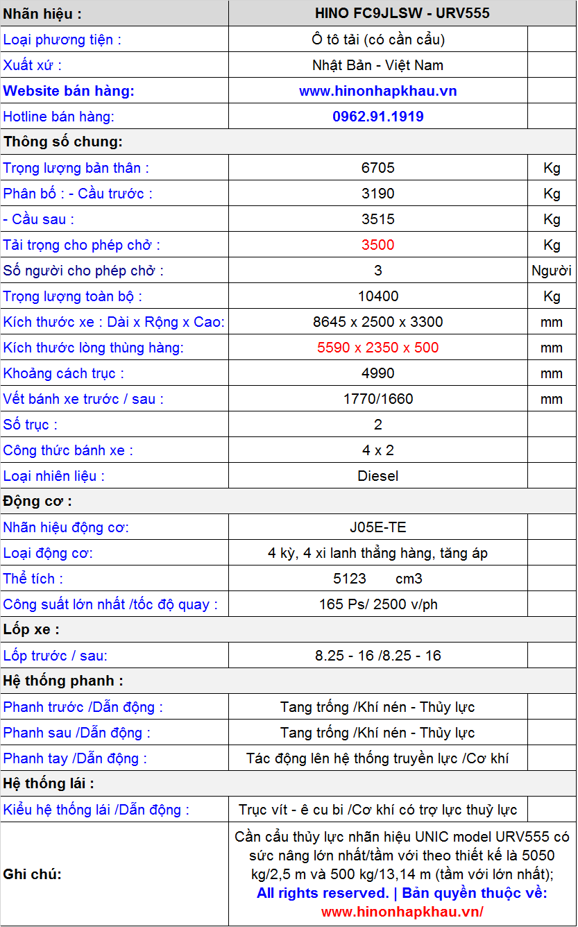 * Thông số kỹ thuật xe tải Hino FC9JLSW gắn cẩu Unic 5 tấn 5 khúc URV555: