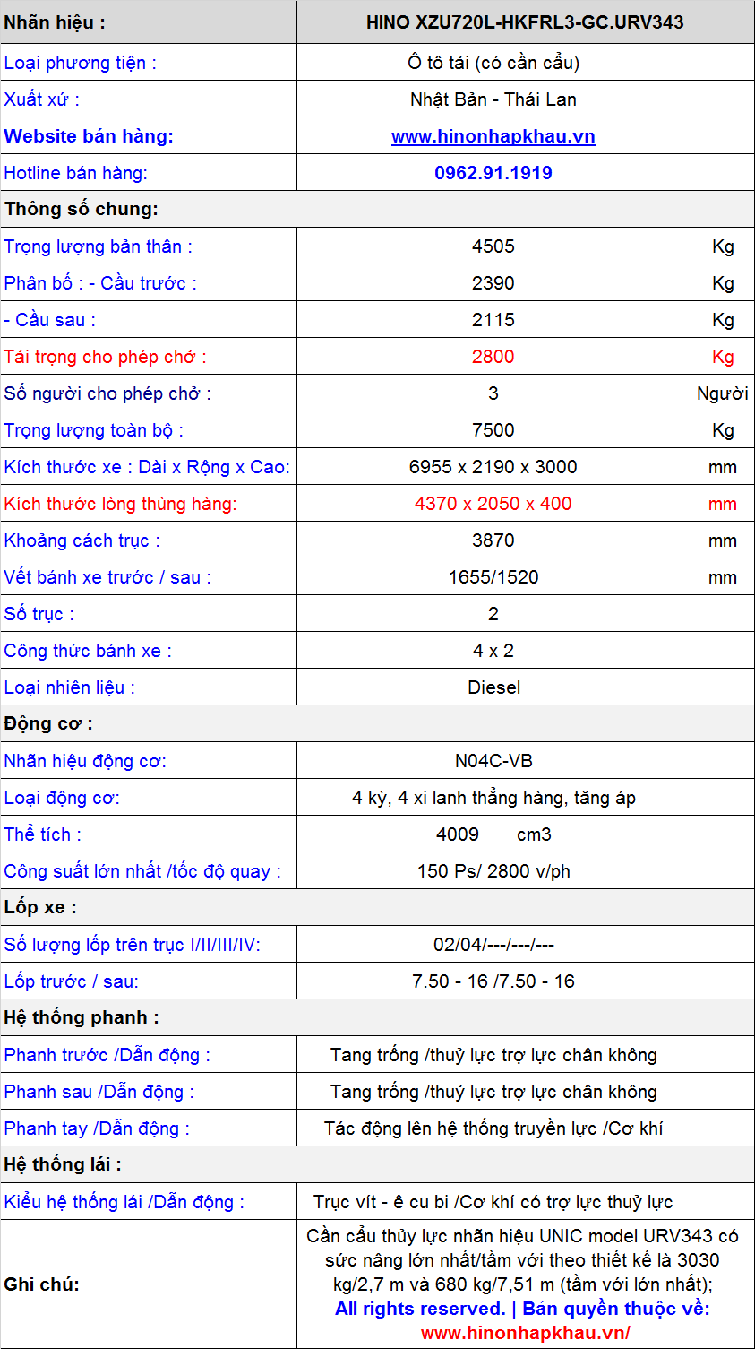 * Thông số kỹ thuật xe tải cẩu Hino 3 tấn URV343: