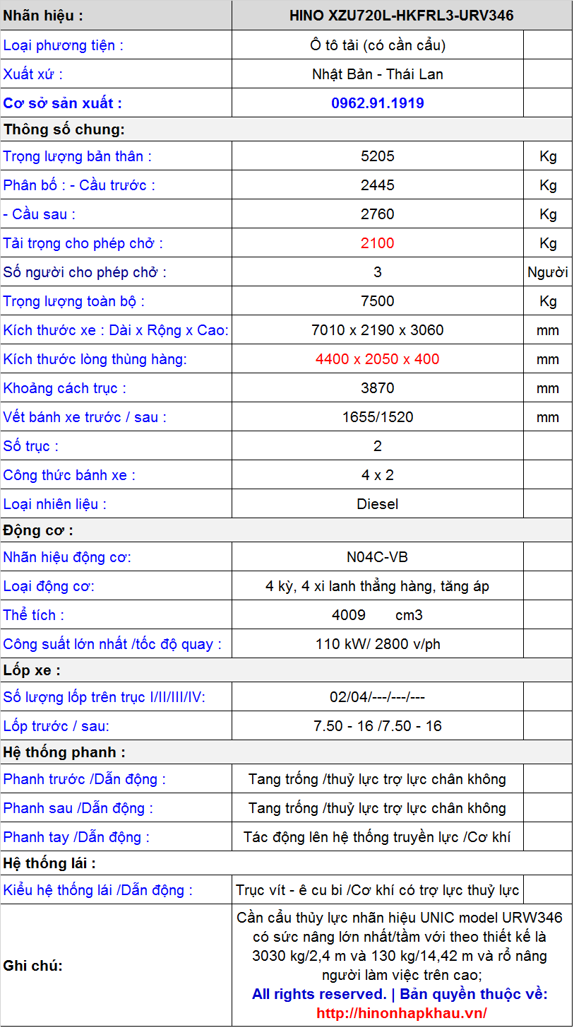 * THÔNG SỐ ĐẶC TÍNH KỸ THUẬT XE TẢI CẨU NÂNG NGƯỜI TRÊN CAO 14,5M HINO 300 XZU720L EURO V