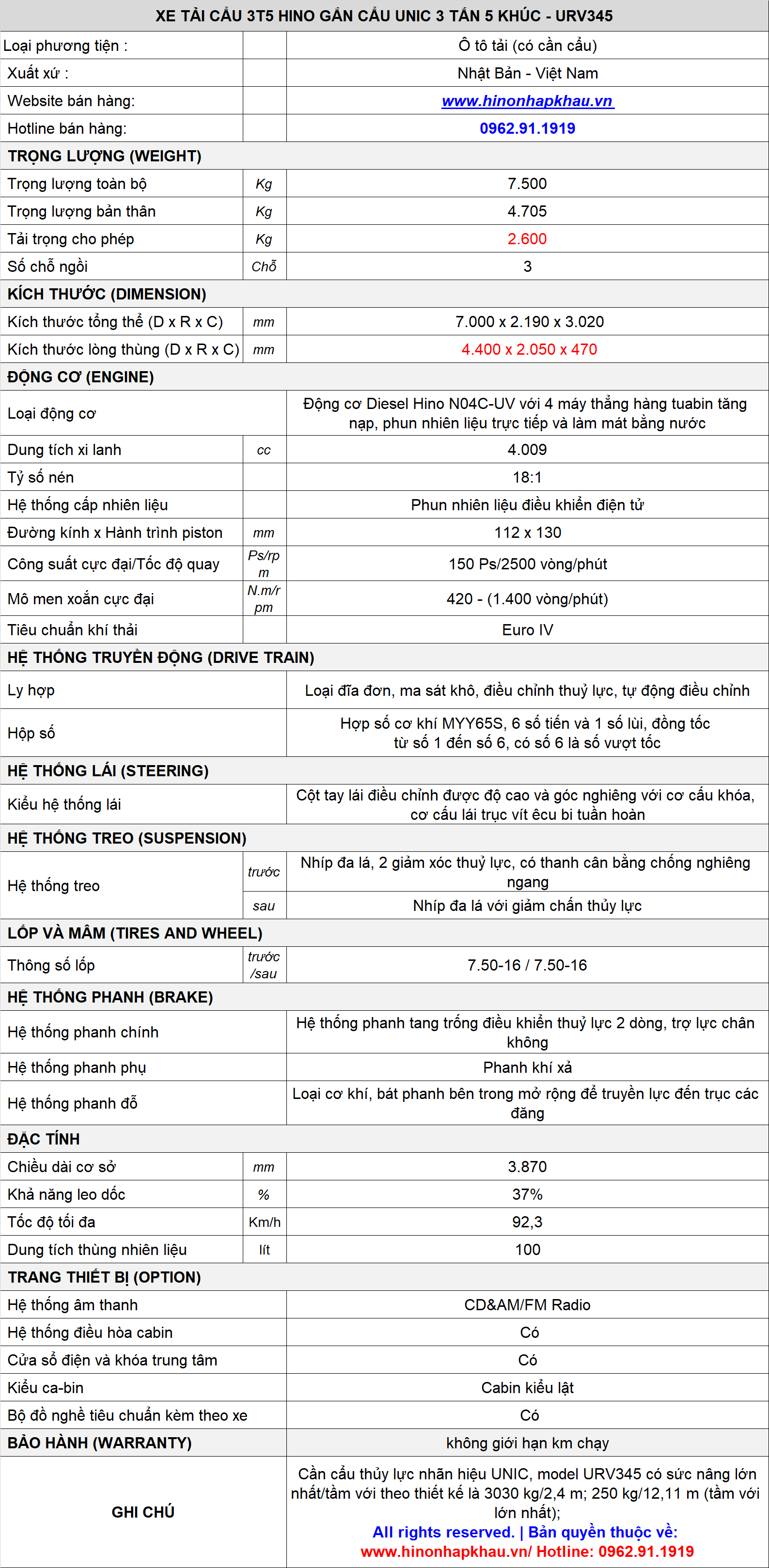 * THÔNG SỐ KỸ THUẬT XE CẨU 3T5 HINO XZU720 GẮN CẨU 3 TẤN 5 ĐỐT UR-V345 NHẬT BẢN: