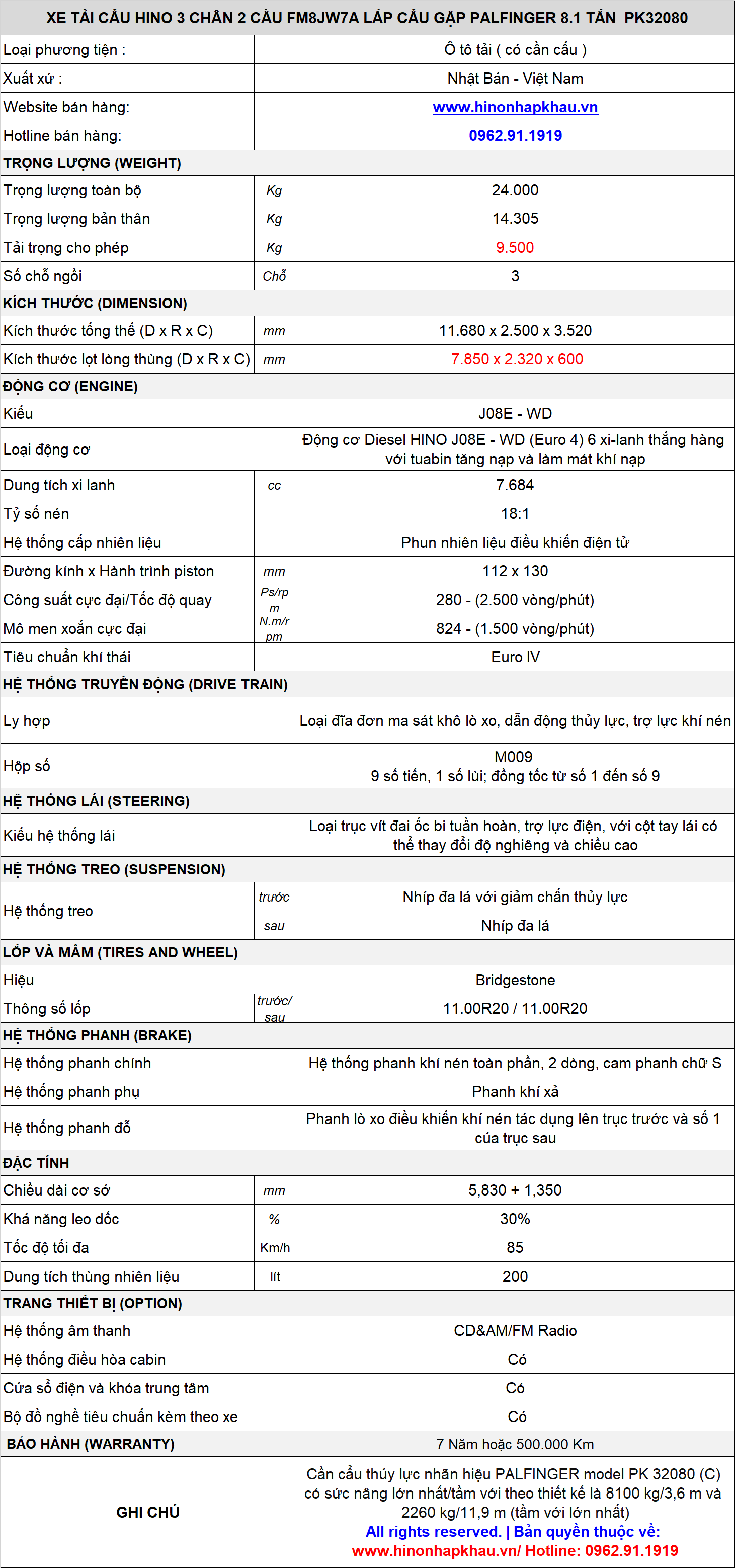 * THÔNG SỐ ĐẶC TÍNH KỸ THUẬT XE CẦN CẨU GẤP 8.1 TẤN PALFINGER PK32080 GẮN HINO 3 CHÂN 6x4 FM8JW8A E5: