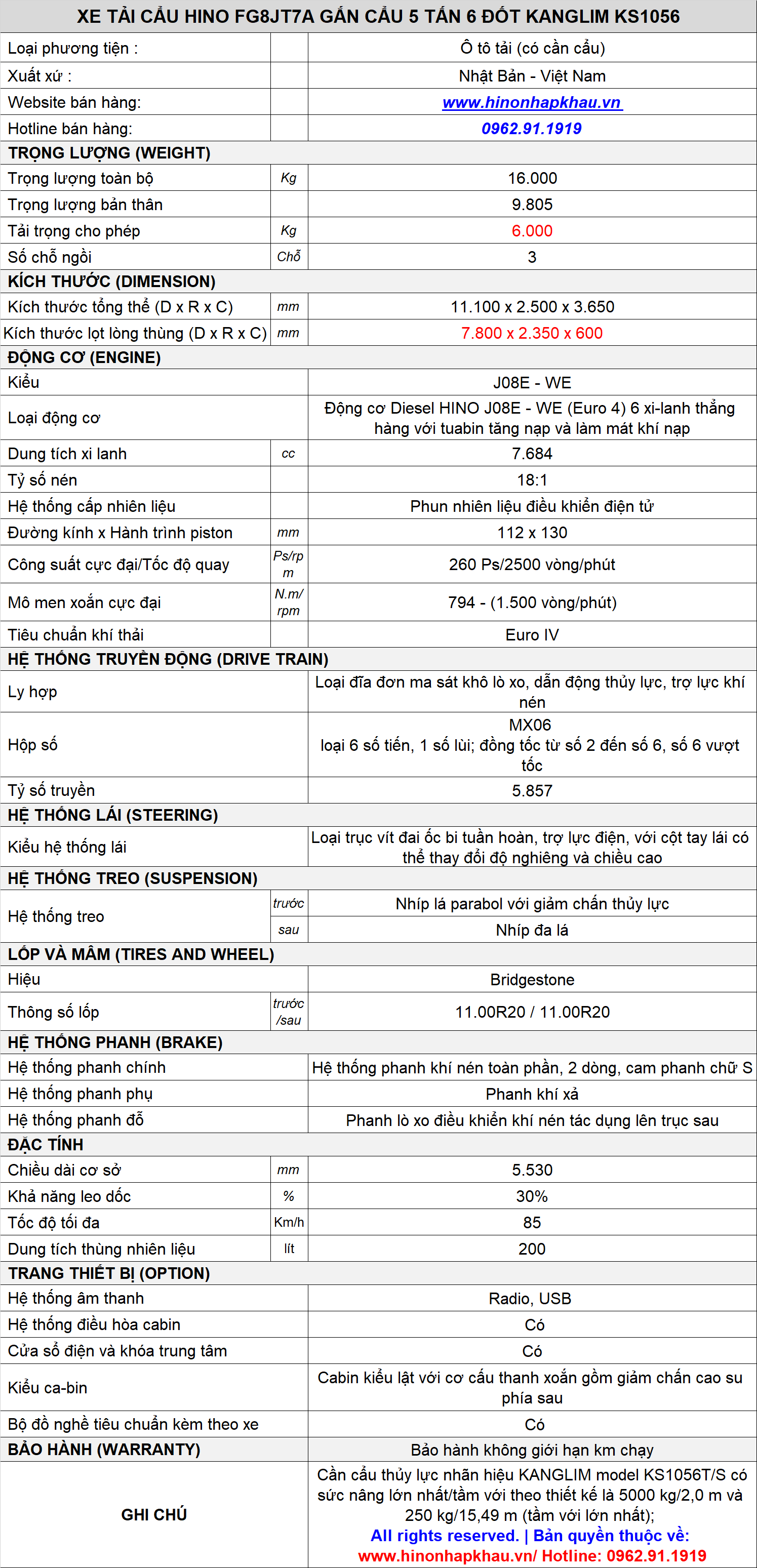 * THÔNG SỐ KỸ THUẬT XE TẢI HINO 8 TẤN GẮN CẨU KANGLIM 5 TẤN 6 KHÚC KS1056 PHIÊN BẢN MỚI NHẤT 2025 - 2026: