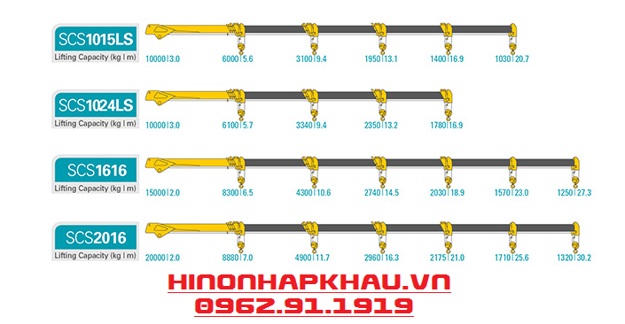 - Cần cẩu có 6 khúc, kết cấu ống lồng kiểu cân bằng