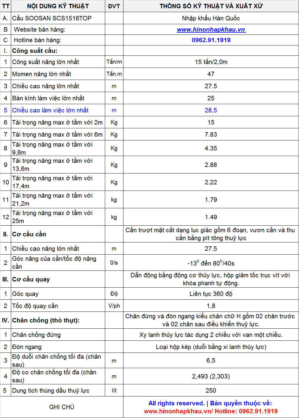 THÔNG SỐ CẦN CẨU SOOSAN 15 TẤN MODEL SCS1516: