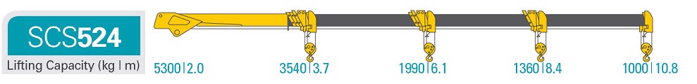 - Sức nâng lớn nhất 5 tấn / 2,2m, 4 đốt cần.
