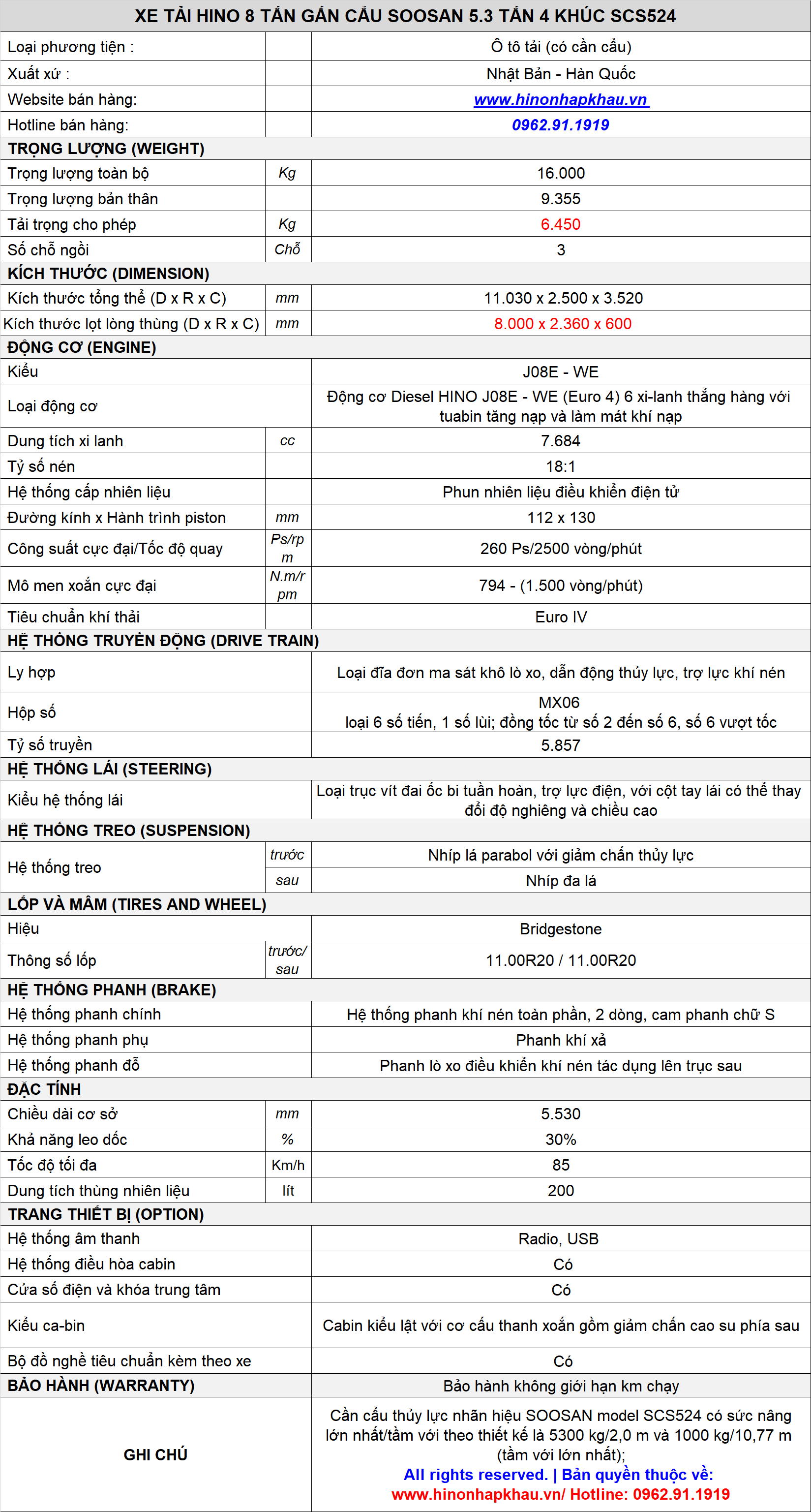 * THÔNG SỐ KỸ THUẬT XE CẨU TỰ HÀNH 5.2 TẤN 4 ĐOẠN SCS524 GẮN TRÊN XE TẢI HINO 8 TẤN THÙNG XE CẨU DÀI 8M: