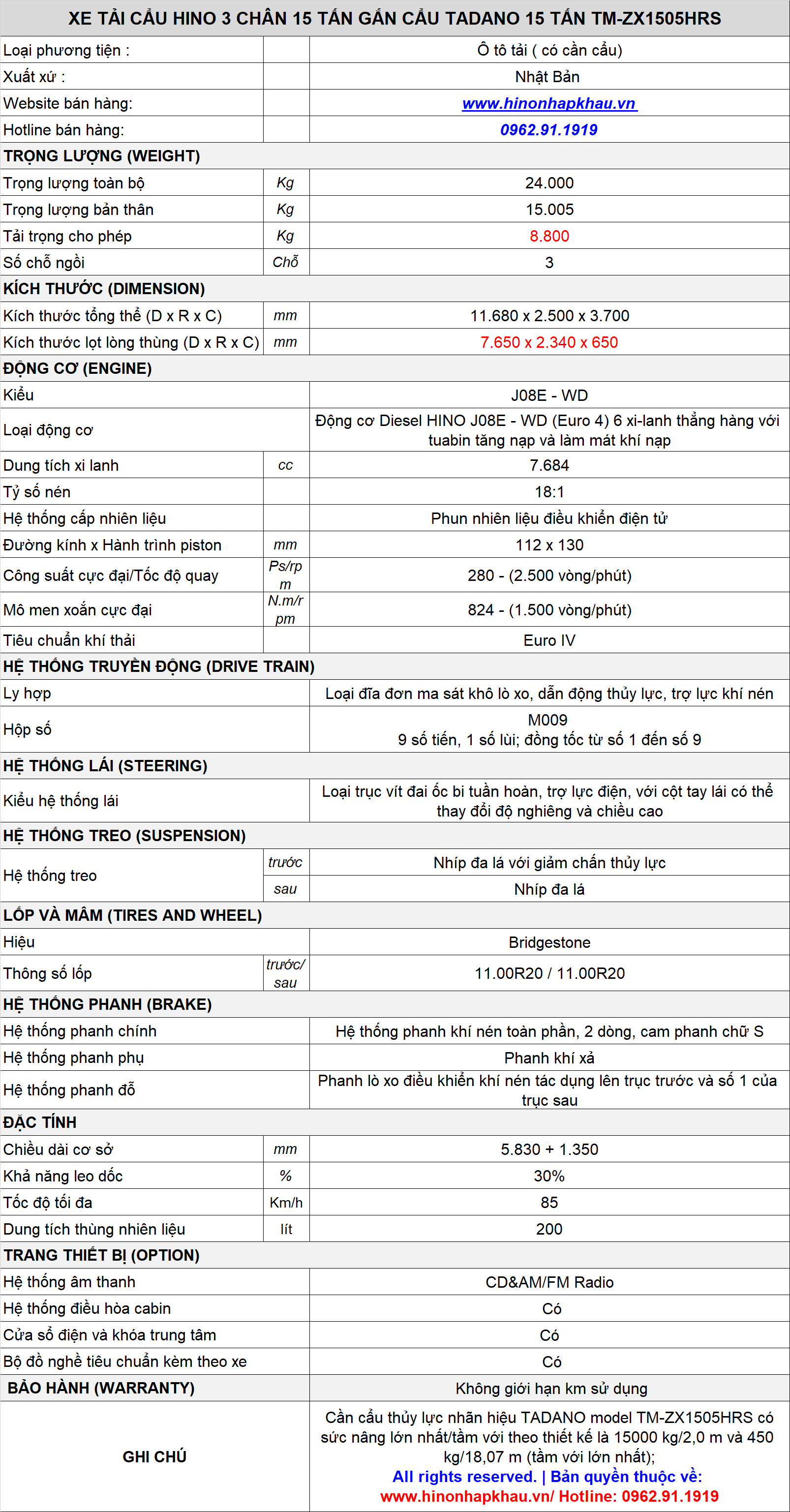 * THÔNG SỐ KỸ THUẬT XE TẢI CẨU TADANO 15 TẤN TM-ZX1505HRS LẮP TRÊN HINO 3 CHÂN 15 TẤN FL8JW8A EURO 5 :