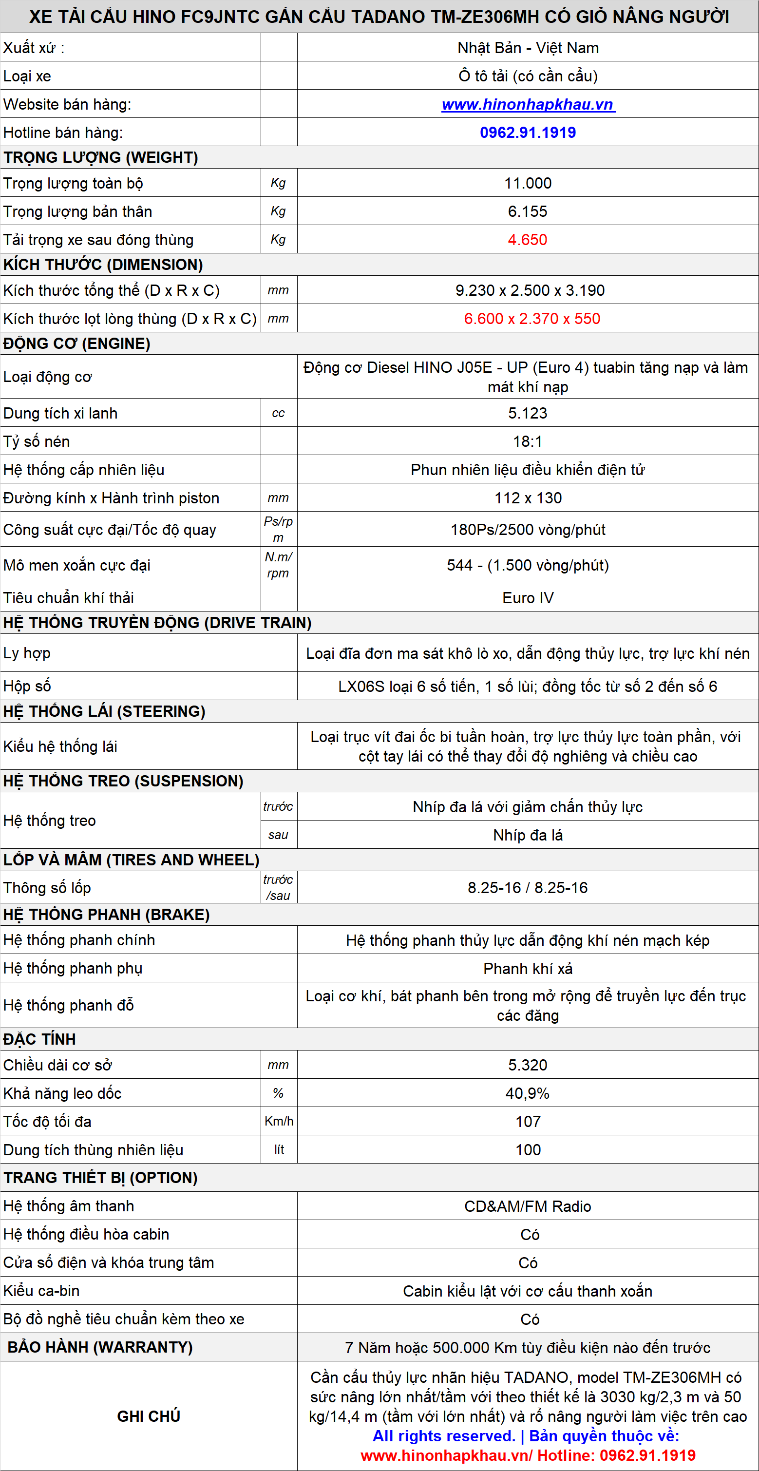 - Xuất xứ: Xe cơ sở nhập khẩu 3 cục từ nhà máy Hino Motor Nhật Bản lắp ráp tại nhà máy Hino Motors Việt Nam. Cẩu tự hành Tadano TM-ZE306MH thương hiệu Nhật Bản nhập khẩu nhà máy Tadano Thái Lan.