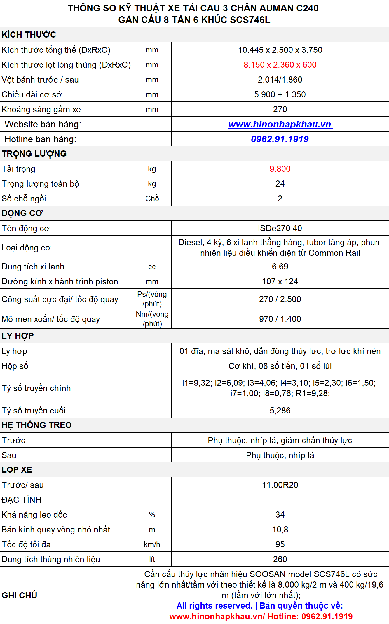 * ĐẶC TÍNH KỸ THUẬT THÔNG SỐ XE CẨU TỰ HÀNH AUMAN C240 GẮN CẨU 8 TẤN SCS746L PHIÊN BẢN 2021 - 2022 MỚI NHẤT: