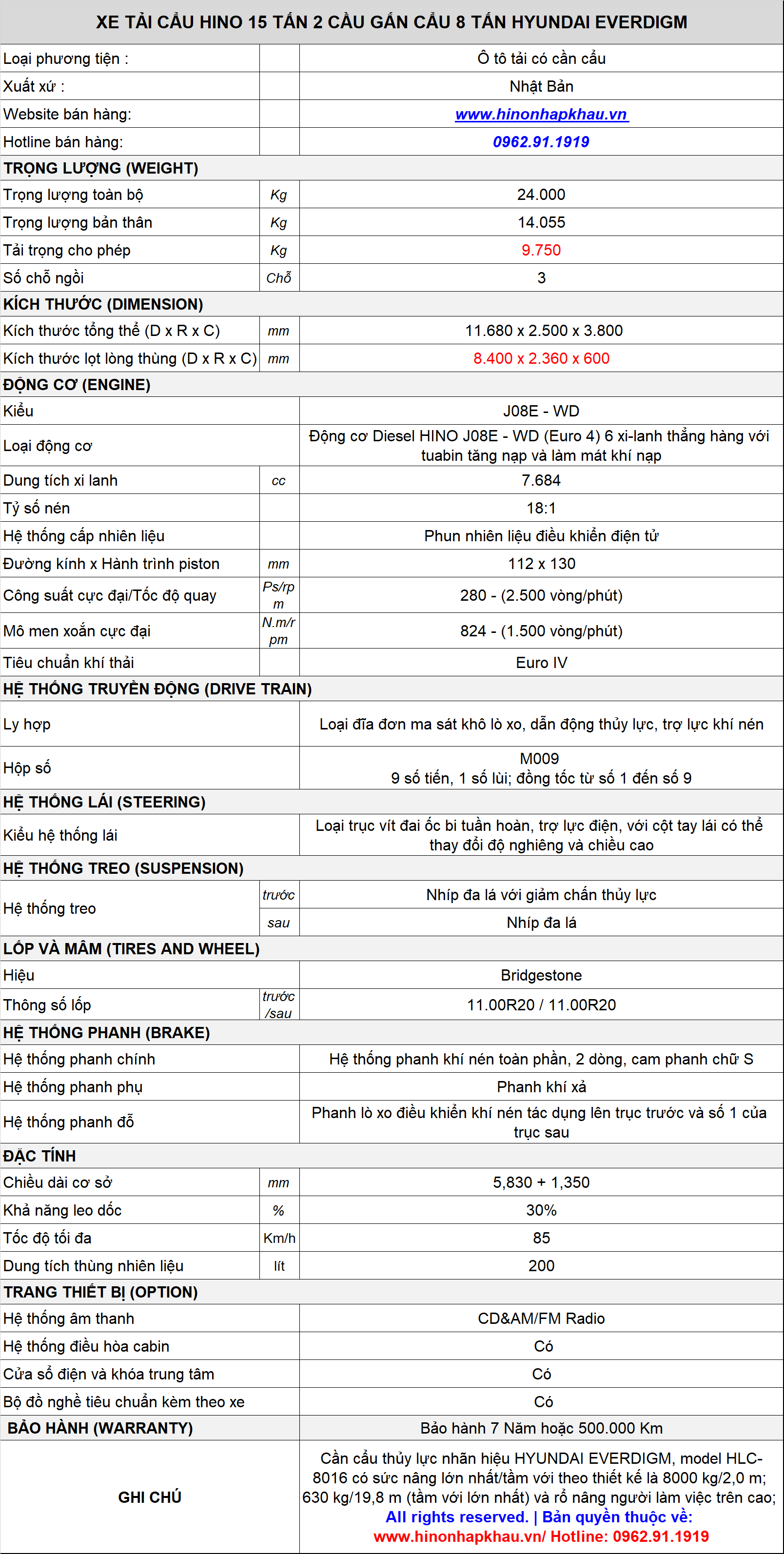 * THÔNG SỐ ĐẶC TÍNH KỸ THUẬT XE TẢI CẨU 8 TẤN HYUNDAI EVERDIGM LẮP TRÊN HINO 15 TẤN FM8JW8A E5:
