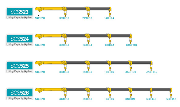 Cần cẩu thủy lực nhãn hiệu SOOSAN model SCS526 có sức nâng lớn nhất/tầm với theo thiết kế là 5100 kg/2 m và 500 kg/15,6 m (bán kính làm việc lớn nhất);