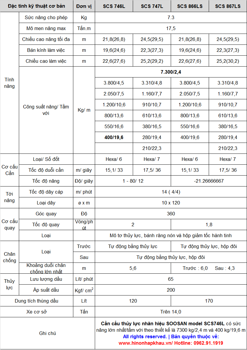 * THÔNG SỐ KỸ THUẬT CÁC SERIES CẨU TỰ HÀNH SOOSAN 7 TẤN 6 KHÚC, 7 KHÚC: