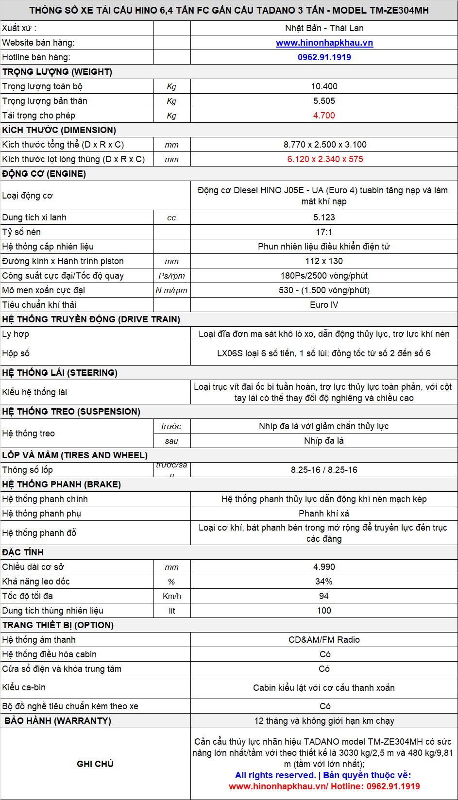 - Xuất xứ: Xe cơ sở nhập khẩu 3 cục từ nhà máy Hino Motor Nhật Bản lắp ráp tại nhà máy Hino Motors Việt Nam. Cẩu tự hành Tadano TM-ZE304MH thương hiệu Nhật Bản nhập khẩu nhà máy Tadano Thái Lan.