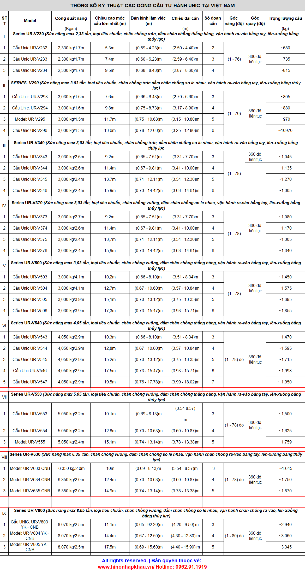* THÔNG SỐ KỸ THUẬT CHI TIẾT CẨU TỰ HÀNH UNIC 3 TẤN URV340, UR-V360, UR-V370 :