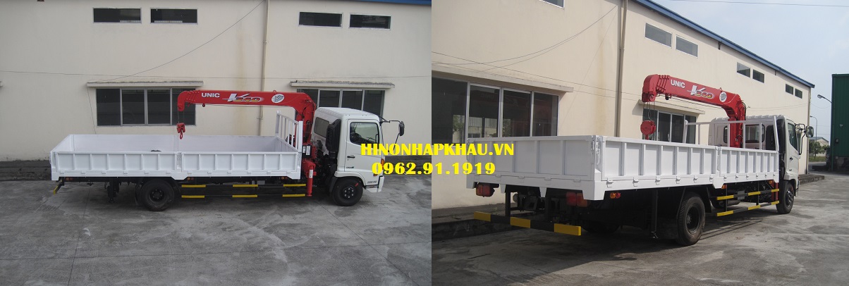 - '' Cẩu unic 3 tấn 5 đoạn gắn trên xe hino 6 tấn FC9JLTC'' dòng xe tải cẩu thuộc Series FC 500 của Hino gắn cẩu tự hành hạng nhẹ với ưu thế kích thước lọng lòng thùng dài 6,13m sau gắn cẩu rất phù hợp chuyên chở cây sắt thép, ống, cột, xây lắp dựng nhà xưởng... Kết cấu xe cẩu unic URV345 chắc chắn với đà dọc và đà ngang bằng Uduc, riêng đà ngang được đan thêm đà gỗ, sàn bằng gỗ dày 2,5cm bên trên phủ lớp tôn đen 2,5mm. Bao sàn bằng thép chấn dày 3mm, khung xương thùng bằng hộp kẽm hoặc hộp đen, Inox theo yêu cầu của khách hàng. Vách bửng bằng thép dày 1.5mm.