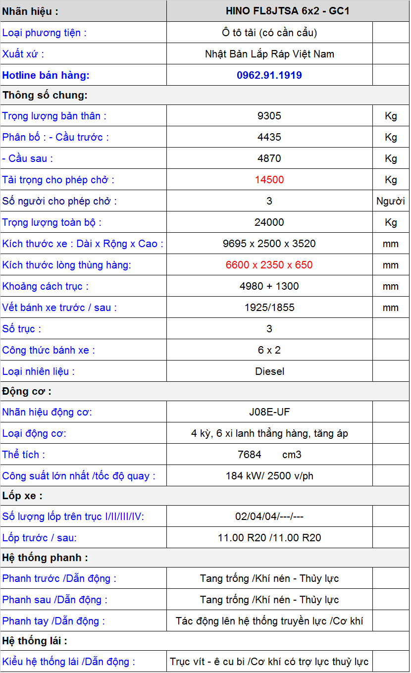 * Thông số kỹ thuật xe tải Hino FL8JTSA lắp cẩu Unic 4 tấn 3 đốt URV543: