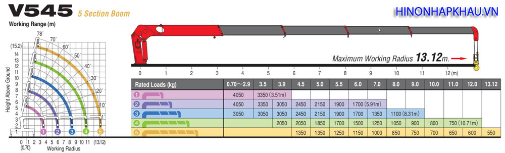 - Bán kính làm việc: từ 0,70 đến 13,12 m