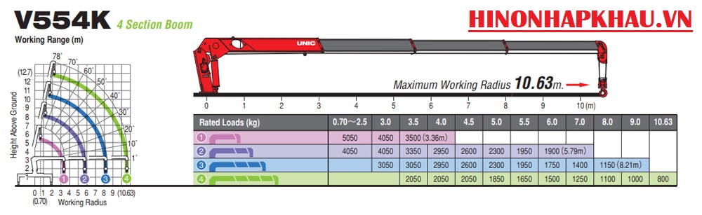 Cần cẩu thủy lực nhãn hiệu UNIC, model URV554 (Spec. K-TH) có sức nâng lớn nhất/tầm với theo thiết kế là 5050 kg/2,5 m; 800 kg/10,63 m (tầm với lớn nhất);